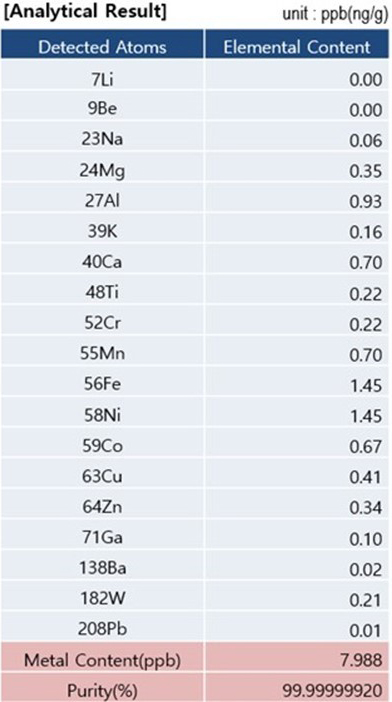 2) 금속불순물이 7.988ppb 농도로 검출되었습니다.